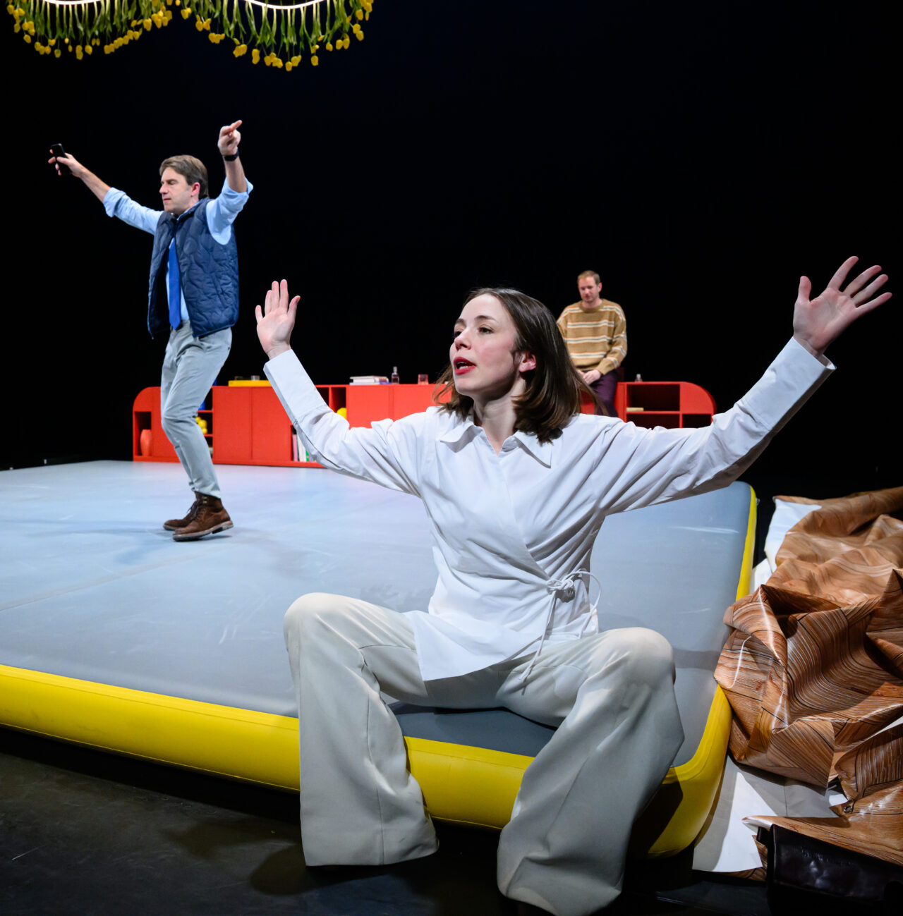 “Ja, ik ben ervan overtuigd dat hoe harder mensen moeten lachen, hoe harder ze ook moeten huilen. Je moet als acteur nooit de fout maken: we gaan eens even lollig doen. We spelen het juist bloedserieus. Het onderbuikgevoel moet kloppen. Juist daardoor wordt het grappig en rauw tegelijk. Doe je dat niet, dan wordt het een soort deurenklucht. Het is trouwens een onwijs leuke groep om mee te werken. Johan is een echte comedian, die feilloos aanvoelt waar de grap zit en hoe je die neerlegt. Remko doet natuurlijk ook veel cabaret. Yara is meer een actrice, maar ook haar gevoel voor komische timing is ontzettend scherp. We hebben ook echt een hele goede onderlinge chemie. Ik weet zeker dat je zoiets terugziet in de voorstelling.”